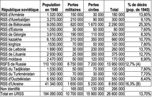 - Union soviétique : Plus de 20 millions de morts (civils et militaires).